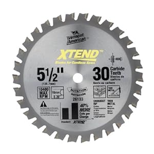 Vermont American 26133 XTEND Cordless Series Carbide Tipped Circular Saw BladesXTEND " Cordless series circular saw blades are specially designed for optimal performance in portable cordless saws. Blades feature scalpel-sharp teeth and a mirco kerf edge to cut with less drag and resistance than standard circular saw blades, yielding up to 40 percent more cuts per battery charge.Vermont American 26133 XTEND Cordless Series Carbide Tipped Circular Saw Blades Features:; Blade design also enhances performance of corded portable saws; Fit most brands of cordless saws; Size: 5-1/2"; Arbor:10 mm; Kerf: 1.6 mm / .063"; Hook Angle: 5 °; Application: .040"; Tool Type: FTG; Tooth Design: ,Non-ferrous metal; Plate Thickness: Portable / cordless; Max. RPM: 10400; Quantity:2:21